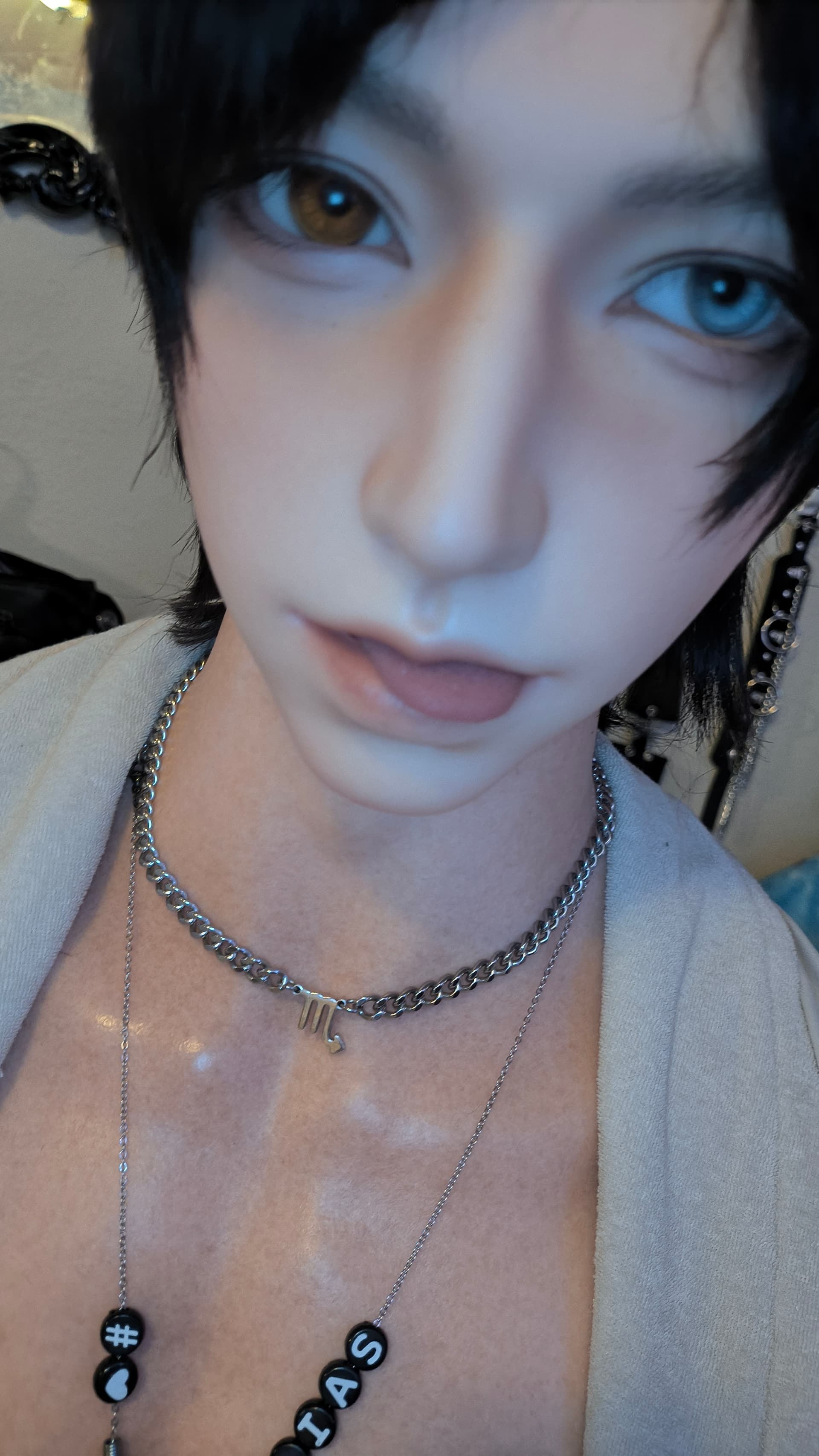 So the ROS mouth when you open his jaw and look in he even has tonsils teeth that are attached and a tongue that while you can’t pull it out of his mouth will feel more realistic when you’re either kissing him or enjoying his oral skills… there is a tunnel behind the tonsils that goes back a good 6 to 5 in and is soft to the touch kind of squishy and tightens around even my finger even though it seems like it would be easy to push something larger down there too… I’m pretty sure if I was a guy I would really enjoy his mouth skills. But since I like taking photos the moving jaw and the oral structure look really good in photographs. It allows me to adjust his facial features just a little bit so that he can look grumpy or surprised or happy… and gives me the option to let him chew on a pen or his shirt or a finger… they did a really good job on making his mouth look realistic and when it’s closed it’s not like it distorts the face any either His face still looks like his hard silicone head with more features. His eyes are easily moved from one side to the other as well. Making for excellent photo opportunities. The irises are very artfully done and beautiful to look at.