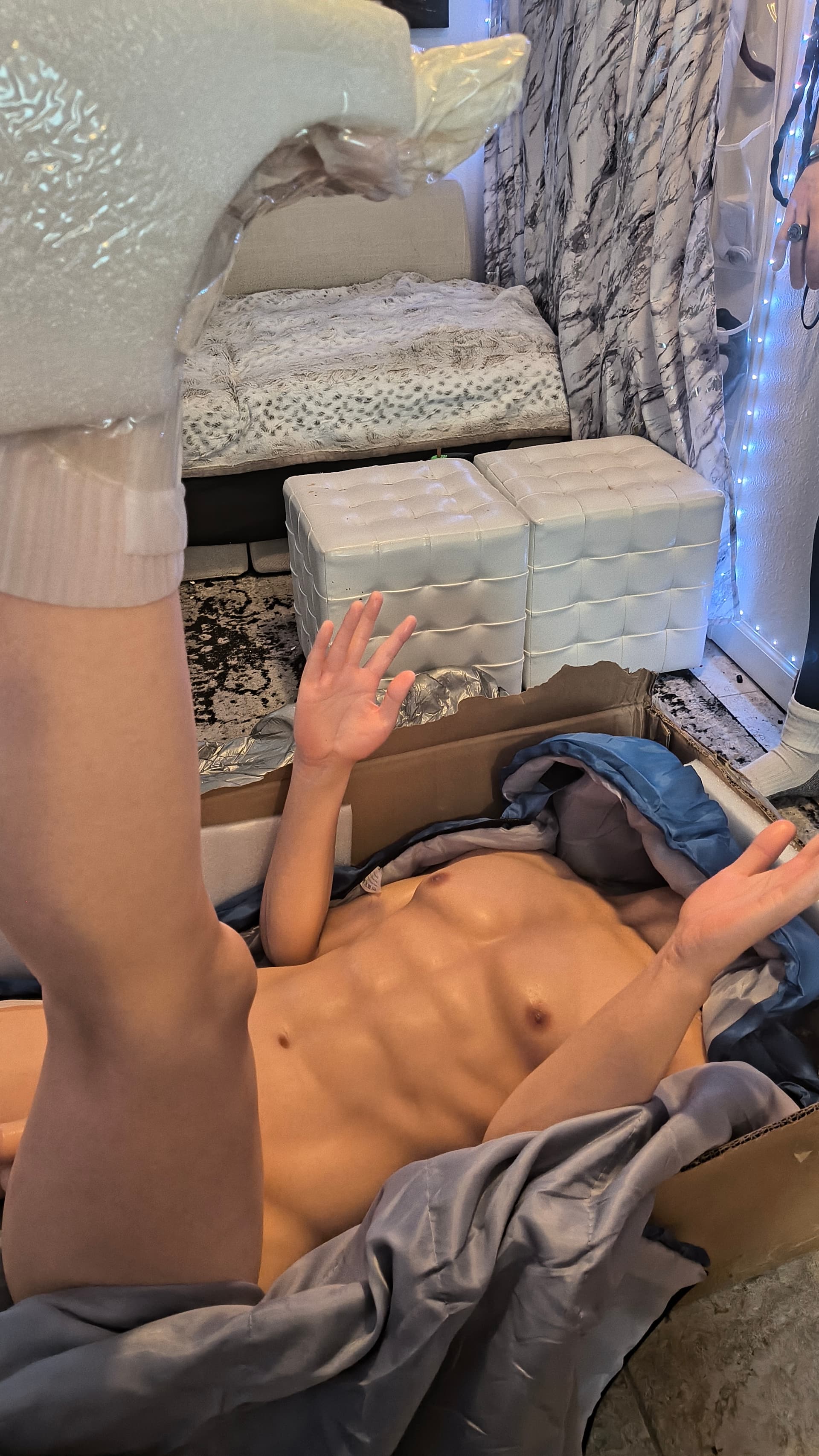 He has implanted eyebrows and eyelashes a hard silicone head and a separate head that also has implanted eyebrows and eyelashes and has an ROS mouth with a moving jaw. I did not get the implanted hair so I can’t review that. His penis is removable with a metal clasp to attach it you have to push the clasp down and then push the peg in to the slot in order to attach the penis firmly this can be slightly challenging my recommendation is to go underneath where the balls would go cuz there’s a little bit of a gap there. This is one of my very few complaints and it’s only a personal preference problem… The color of the penis is a little bit off from the color of the body. This seems to be true with most male dolls that don’t have an attached penis. A positive side to this is that when they painted it which they did very skillfully… this particular brand did not choose to use extravagant colors for different parts of it. Which I very much appreciate. I do recommend getting pubic hair for this area mostly because it’ll hide the attachment and possibly negate from the color difference being that big of a deal.