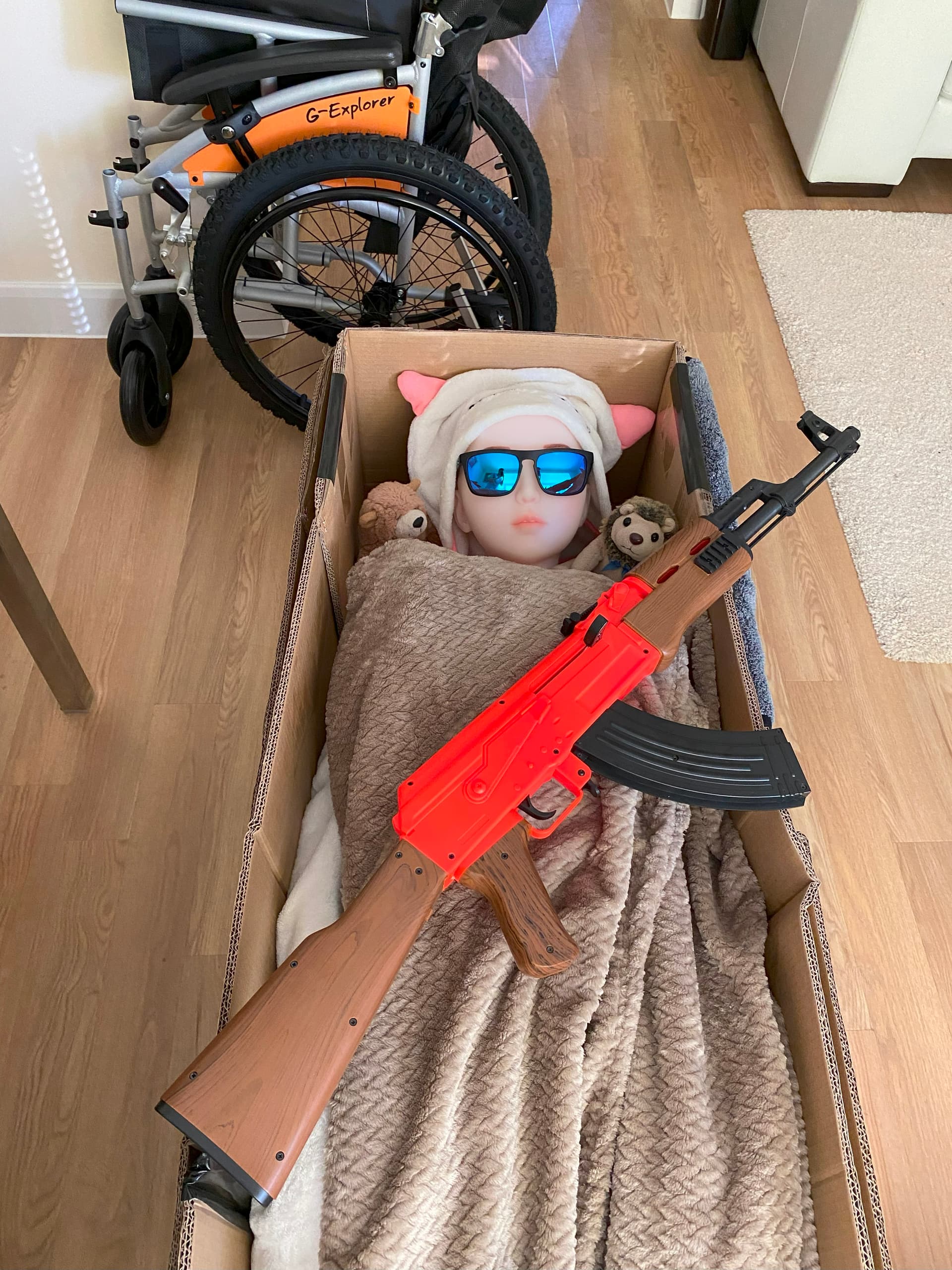 Akira always calls me “Mr Flibble”. No matter how often I explain I changed my name, it’s always “Mr Flibble”. Miss K is quite stubborn. But she is adorable and very good company. That’s why after only a month or so of ownership, she was my number 1 choice (out of maybe 13 dolls at the time) to go to the 2021 UKLDF Doll Meet. Here she is getting ready to go in the back of my car (with her Kalashnikov):