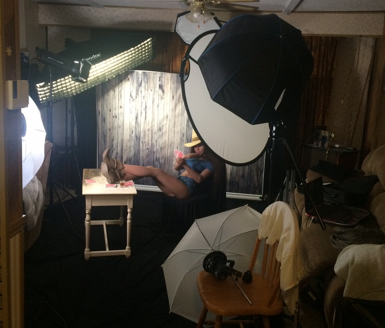 Cool JD! I love it! So fun to look at all the details…Not just your light set-up and the temperature setting but look at the chick on the Telly looking at what a babe you have posing there… Also the mouse and pad with the crumpled up receipts are winners too!