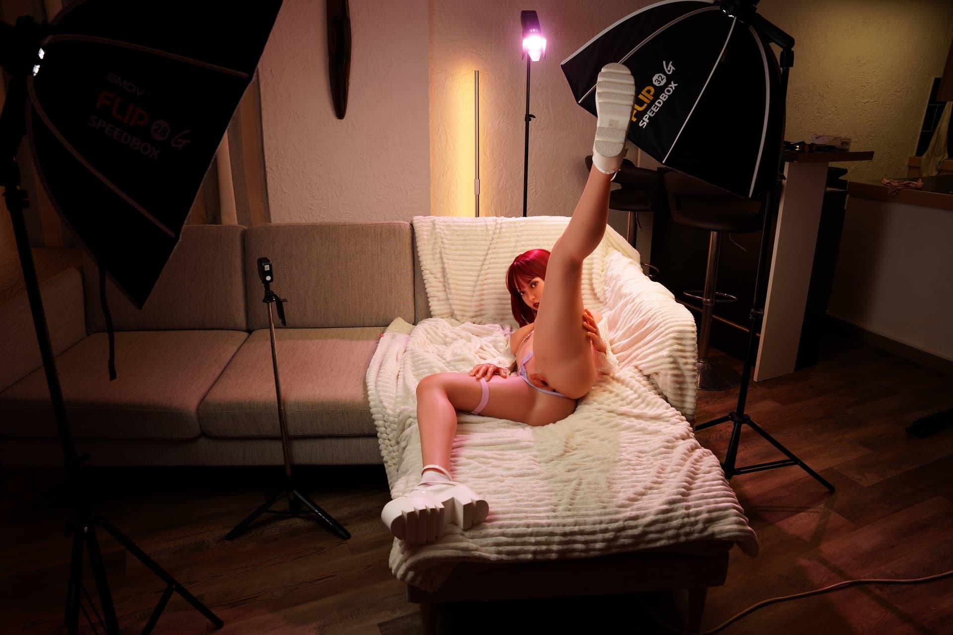 2x Godox ad100 pros with one amber gel in two SMDV speedboxes, 1x Godox ad200 pro as hard light with a pink gel. I use a little Godox Litemons as a continuous light to help the auto focus.