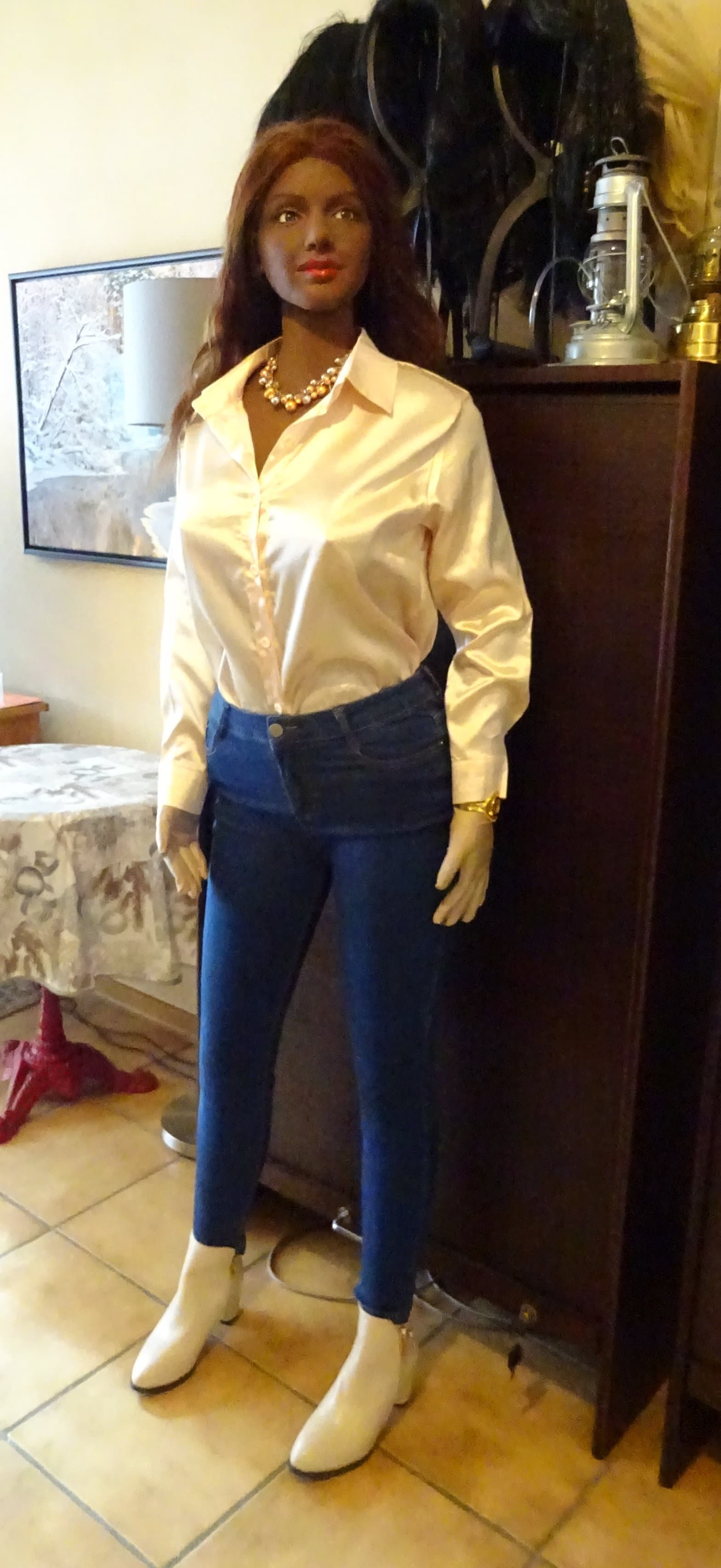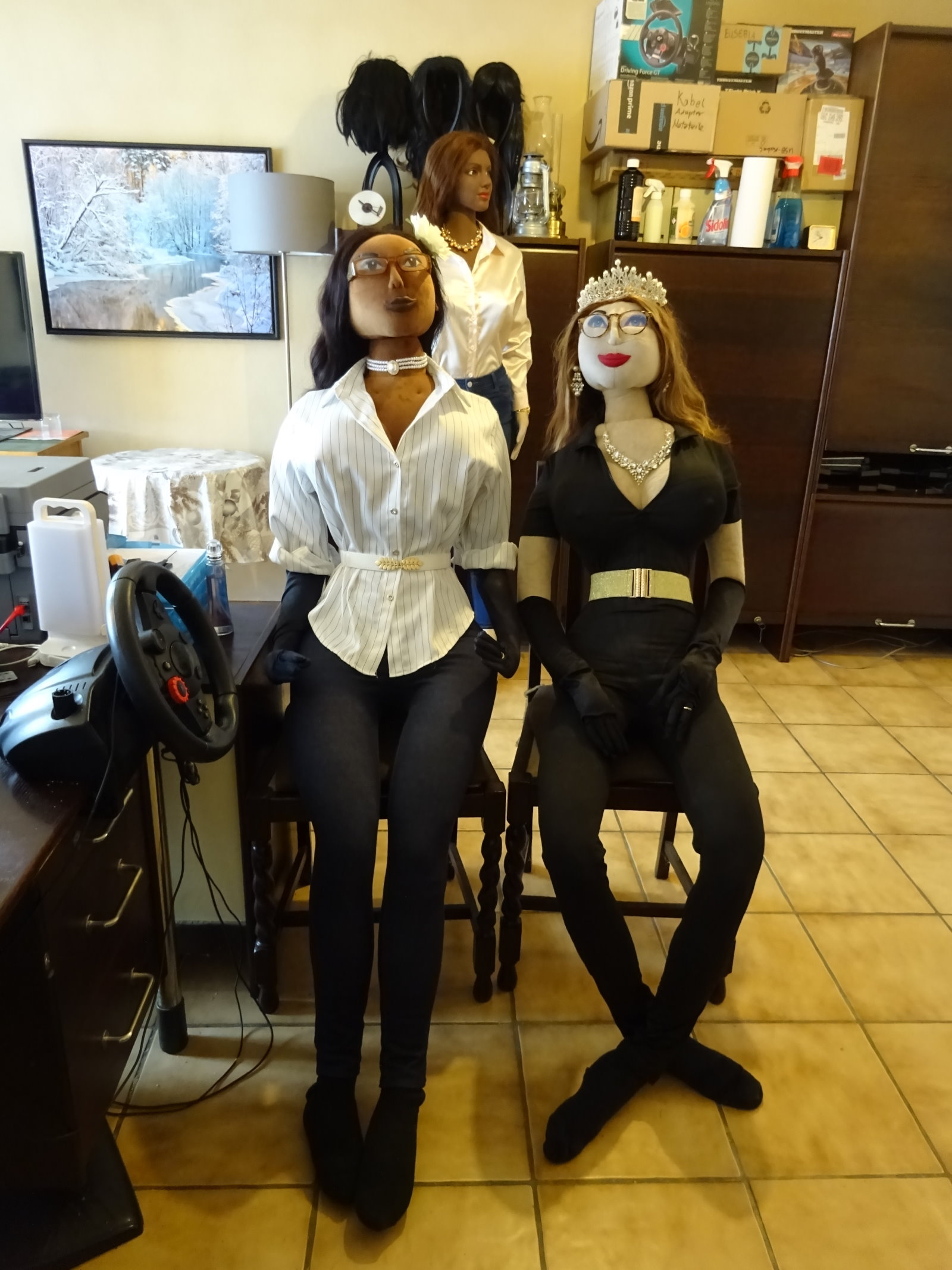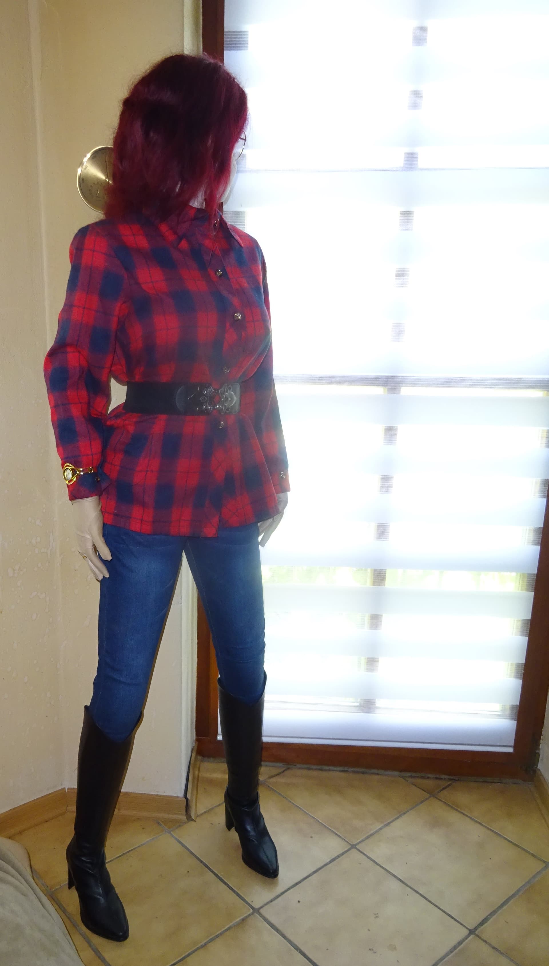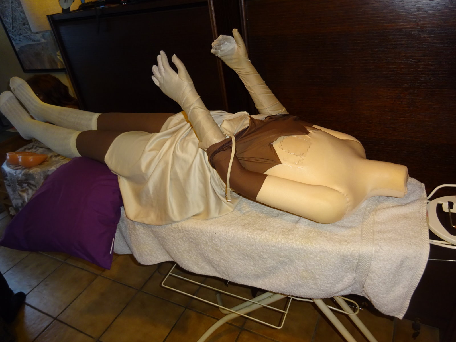 After her breast surgery and some resting time Michelle got up and dressed for a visitor coming this monday. We had a visit from our chimney sweeper who was doing the regular fire place review. These photos are also a test for her makeup which is necessary due to the shining finish of her face which makes it close to impossible to make photos of her face (thanks Irontech for that inconvenience). I used dark brown makeup and some transparent fixing powder. Can only make photos without flashlight though, otherwise the powder shines too bright.