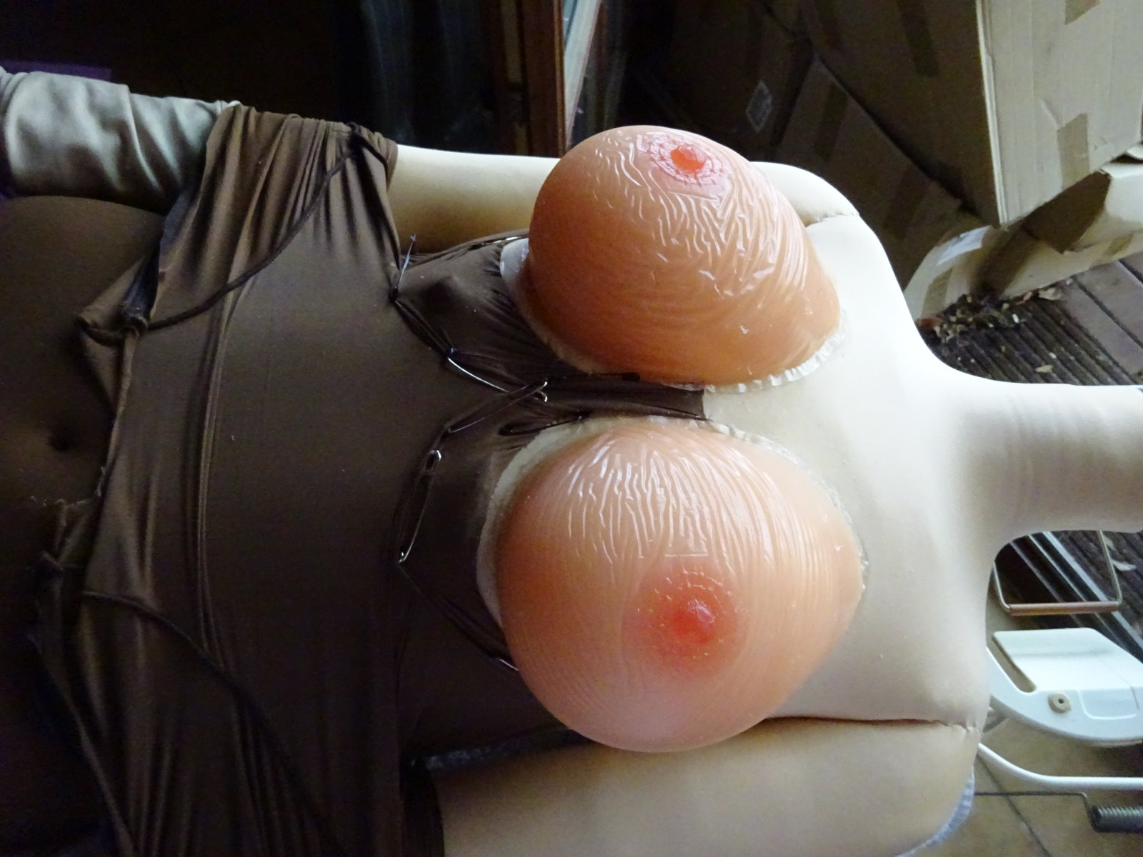 ! Actually they never felt correctly glued to the body, the outer rim has always been feeling loose thru her fabric skin. After a while it looked as if they moved. So I opened the zipper in her back and moved her skin down. Her boobs fell practically my way. They were mostly held by the outer skin which is sewed to the body around the boobs. The “glue” was still somewhat sticky which means the glue was not correctly mixed so that it couldn’t cure. A clear production fault and warranty case Mr. Happy Doll!!!