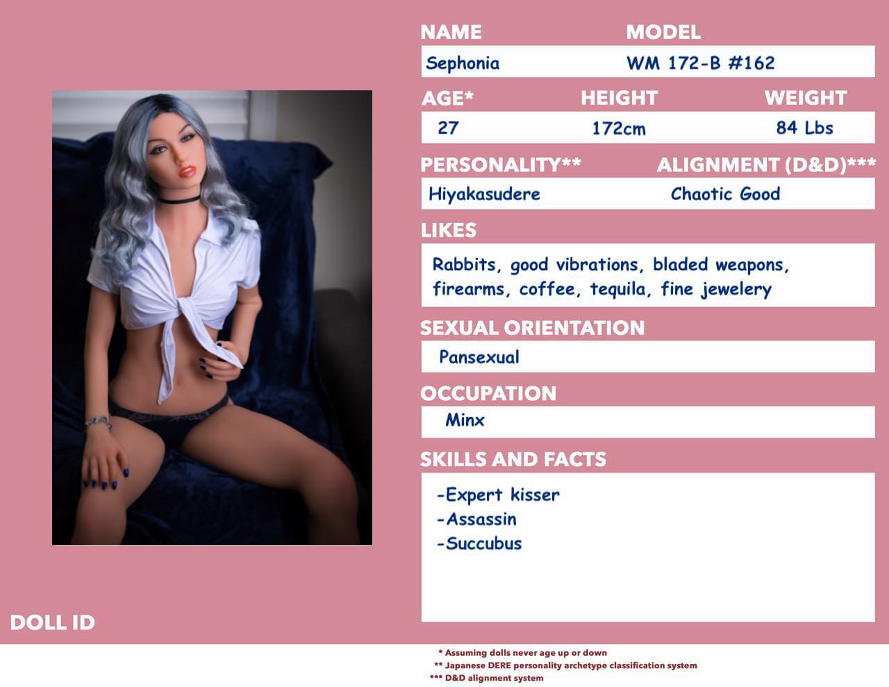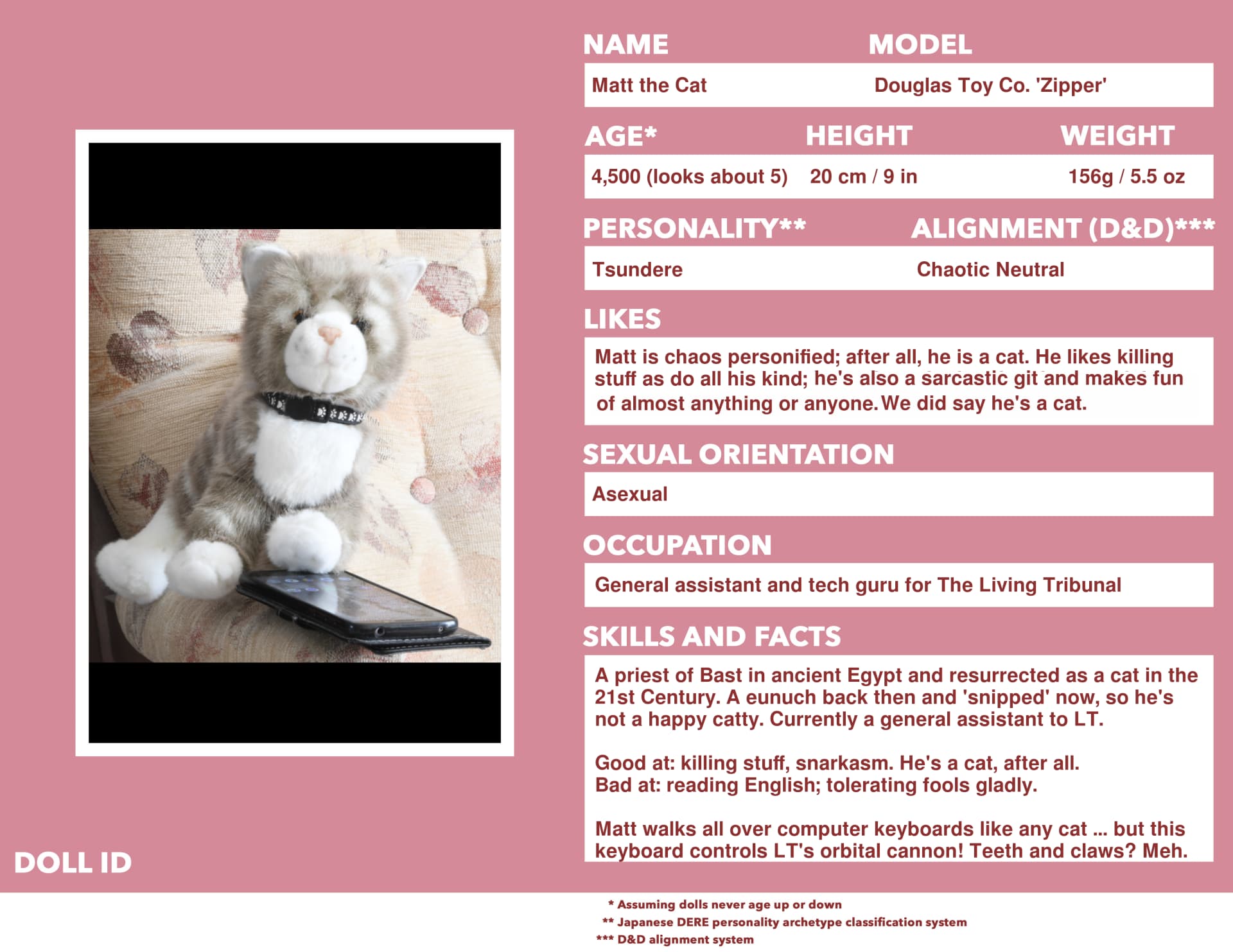 I’m using manga/anime archetypes and D&D alignment charts because I find those quick and intuitive to describe personalities without typing a wall of text.