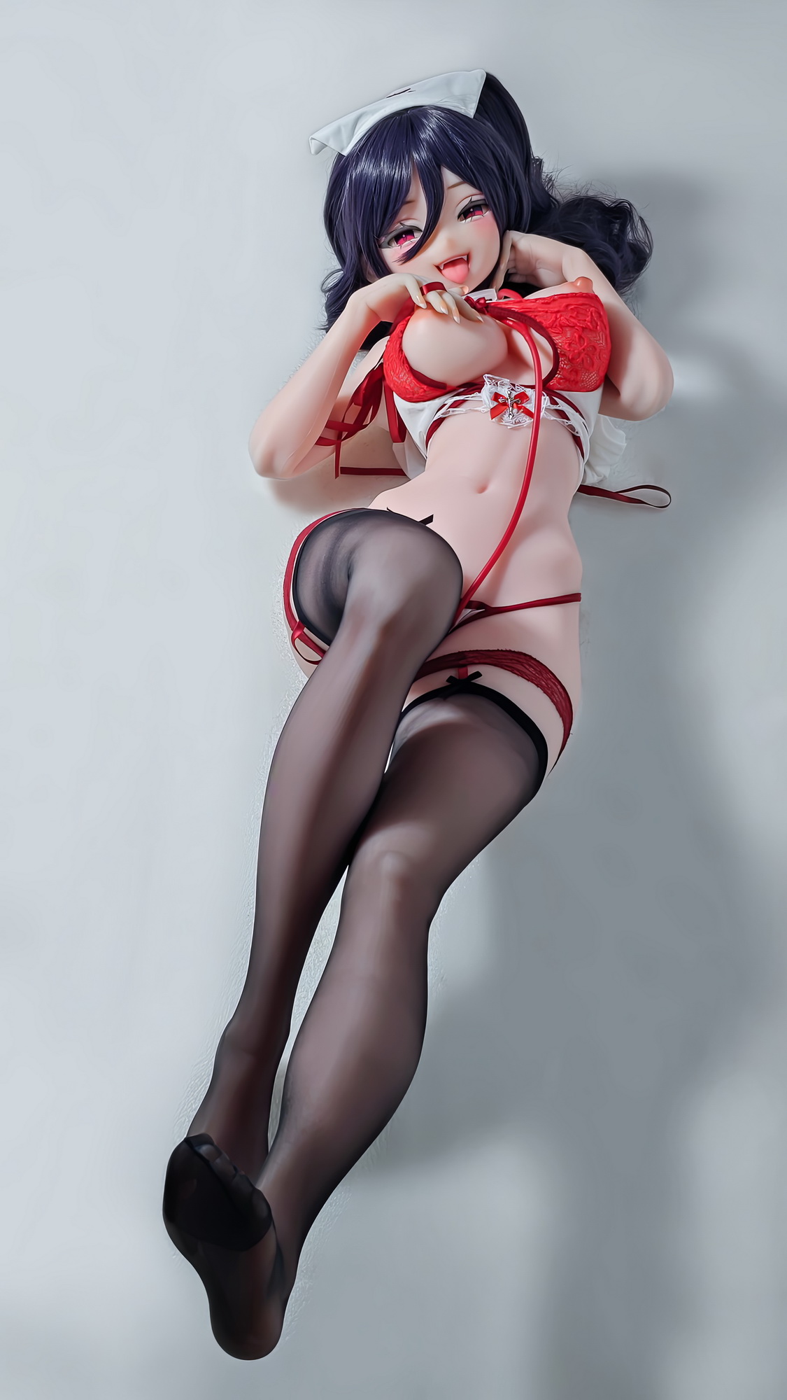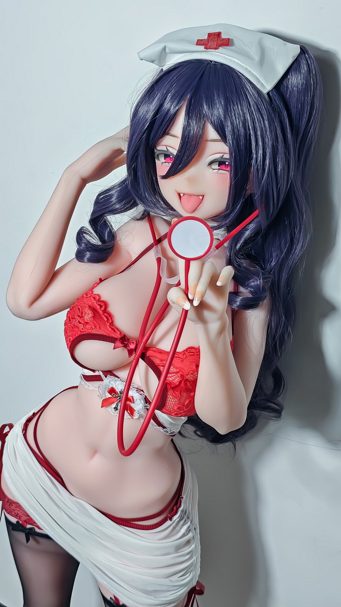 Under the soft light, she wore an unusual nurse’s dress, the red fabric clinging tightly to her alluring curves.