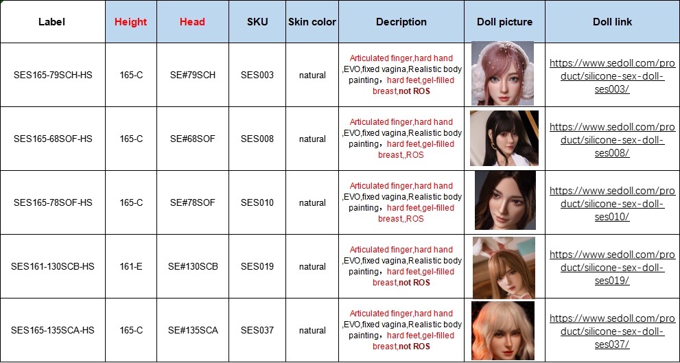 Great news! A new batch of silicone dolls has just arrived at our U.S. warehouse. This shipment includes five different models, with 2 pieces of each, and comes equipped with premium features such as articulated fingers, hard hands, EVO skeleton, fixed vagina, realistic body painting, hard feet, and gel-filled breasts, among others.