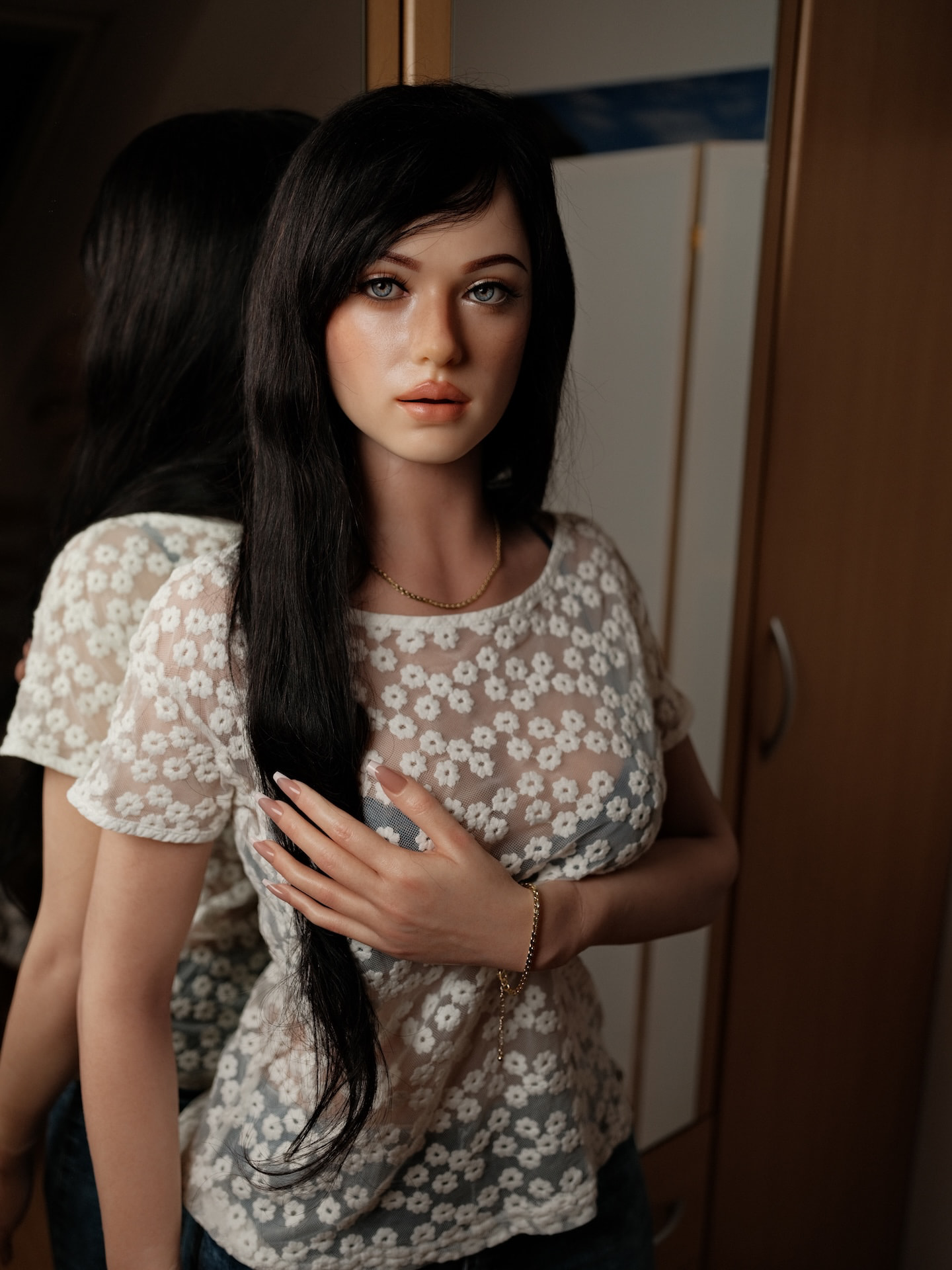 KuLovedoll is a rather new brand and they have not yet mastered weight reduction fully so she’s not the lightest doll I have. She has a wonderfully nice full body, soft and ample breasts a soft butt and the skeleton is good. It does not have all the bells and whistles as other brands. Her wrist cannot flex sideways, the hand turns rather close to the wrist and she has no opposable thumbs. But this is something I’ve only seen at MMX. The transition from hard to soft is slightly visible but still very okay. There is a noticeable colour difference between head and body but also something I can work with. Feet are on the smaller side, also nothing really new with dolls.