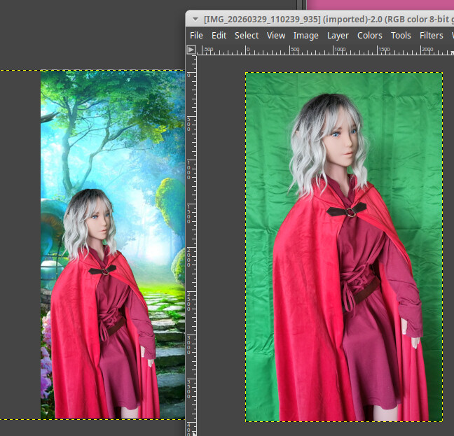 I hope you’ll be able to experiment with all of this. I also have a blue background (3m x 2m). It works well too. I could have used it for this montage since Hadaly’s clothes are green, but it wasn’t a problem. In that case, before cutting out the image, you need to increase the contrast.