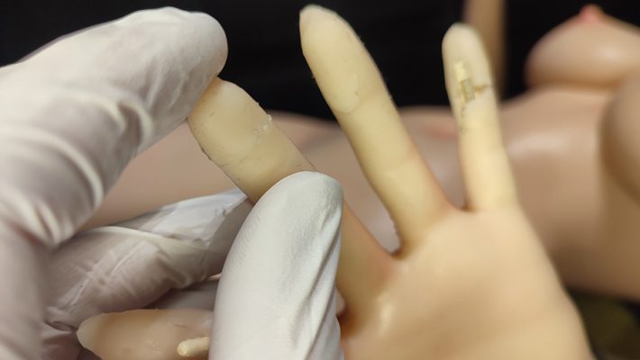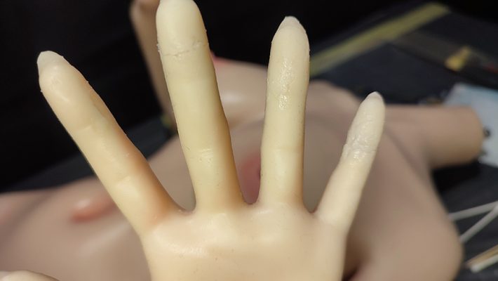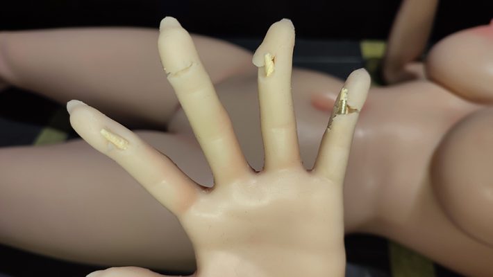 Sil-Poxy is available in-store and online retailers; it is my primary choice when it comes to repairing silicone sex dolls. The difficulty with gluing silicone is that silicone only bonds with other silicones. Thus, normal glues are completely useless. I use multiple applications of Sil-Poxy to build up layers because the damage, especially to the fingers, is so extensive that a multi-layer buildup of the material is necessary. This leads to a coarser result than with a single layer of Sil-Poxy, for example. I accept this, however, because the sex doll’s fingers are so extensively damaged that I can’t repair them any other way. A flat toothpick or a thin metal serum spatula is recommended for application.