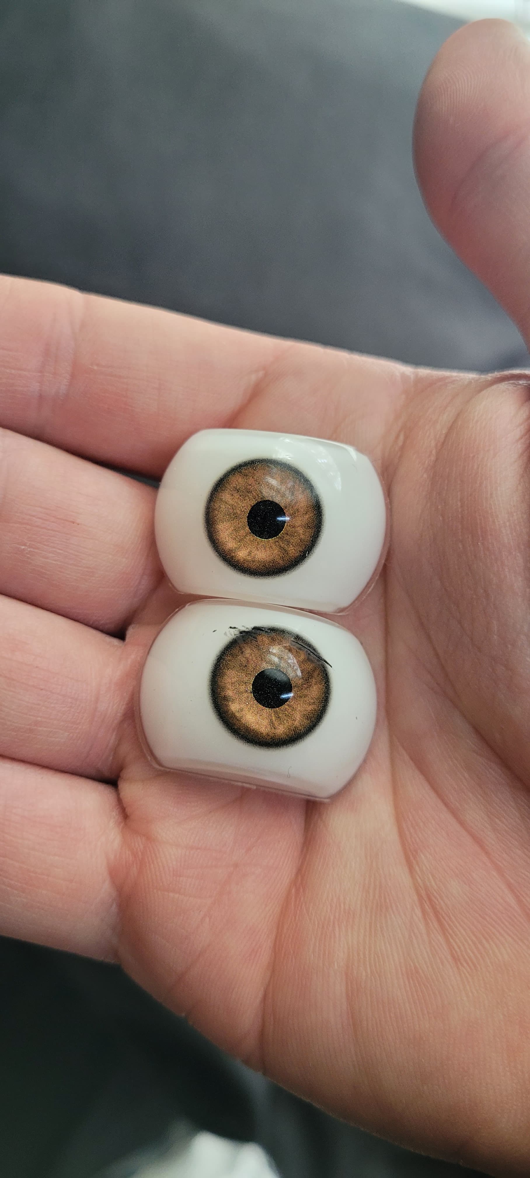 You can see one is scratched and one has the pupil off center, making it impossible to have looking right. They arent even full hemispheres! I hope they see this and improve the eyes they offer.