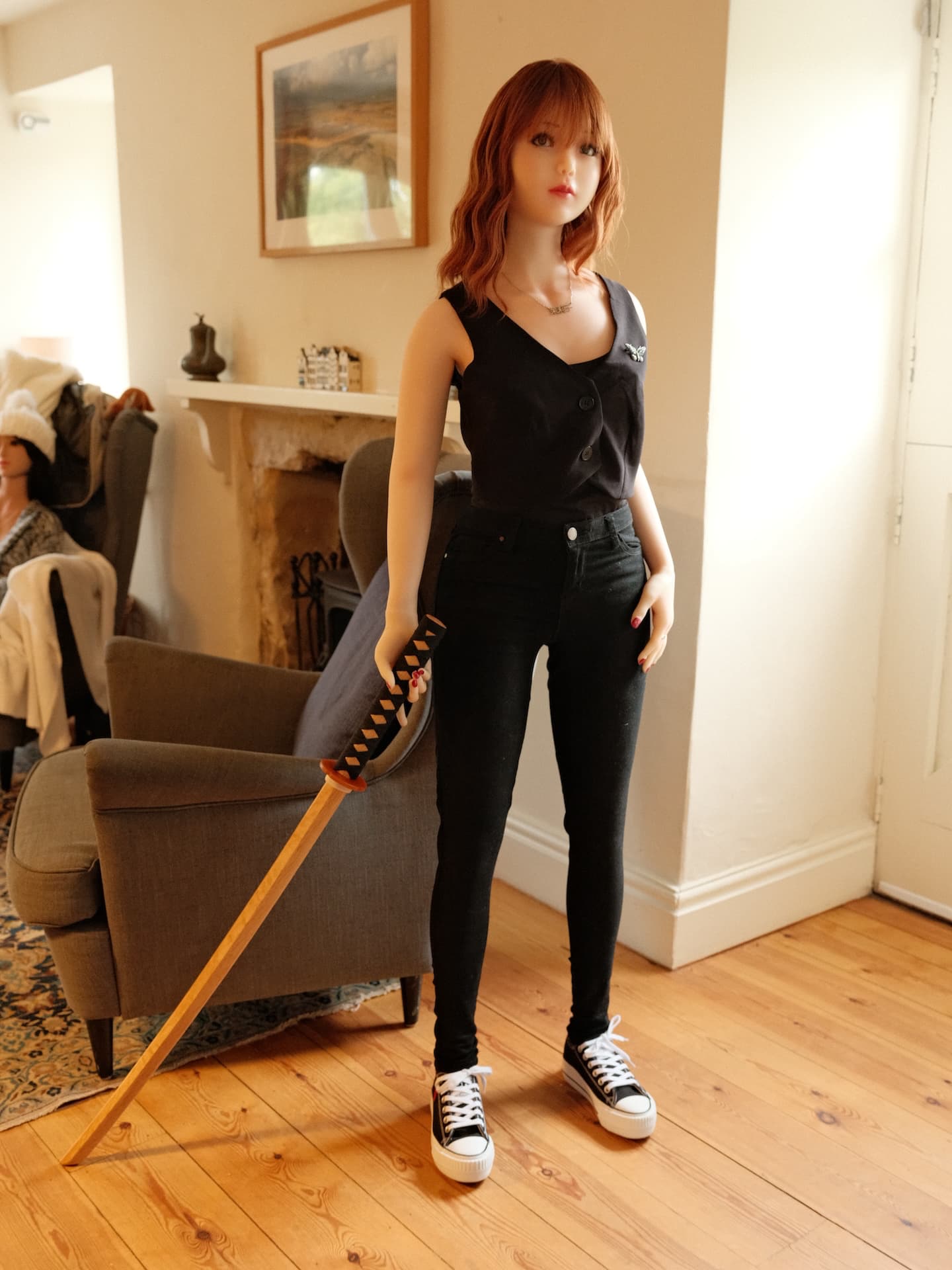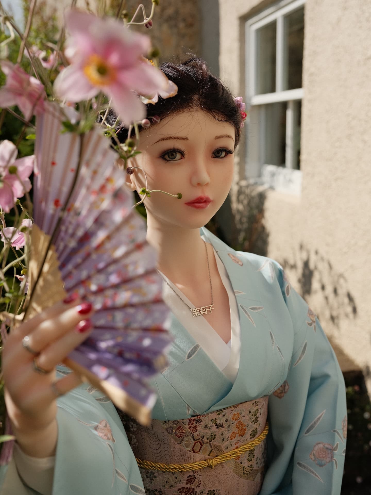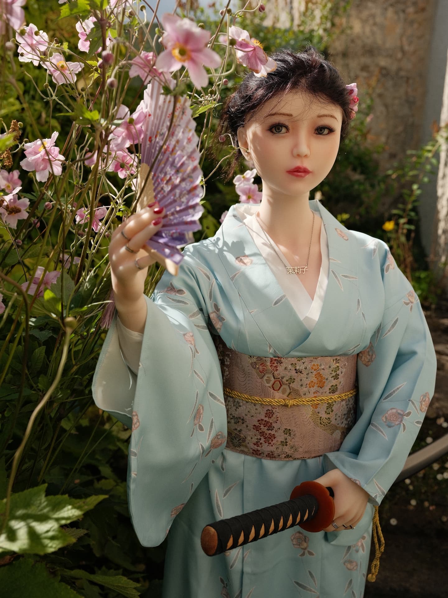 just took a step out of the kitchen and we were in a nice little nook with beautiful flowers and Mariko was happy. After the photos in the Kimono she dressed in her black stuff but would not let go of the bokken. My silent deadly assassin ![]()