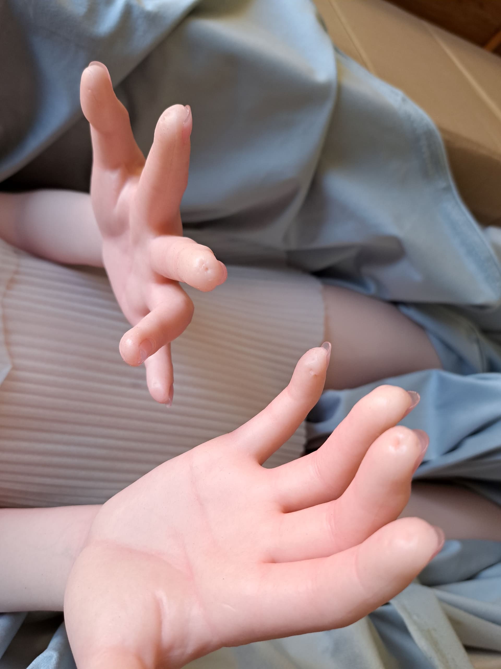 When you turn the hands in a more natural position you get a twisting in the silicone as you can see in this picture. I think that’s where one criticism can be made. I’m aware that some people mentioned the hands look too big for the arms and I think this is the reason why.