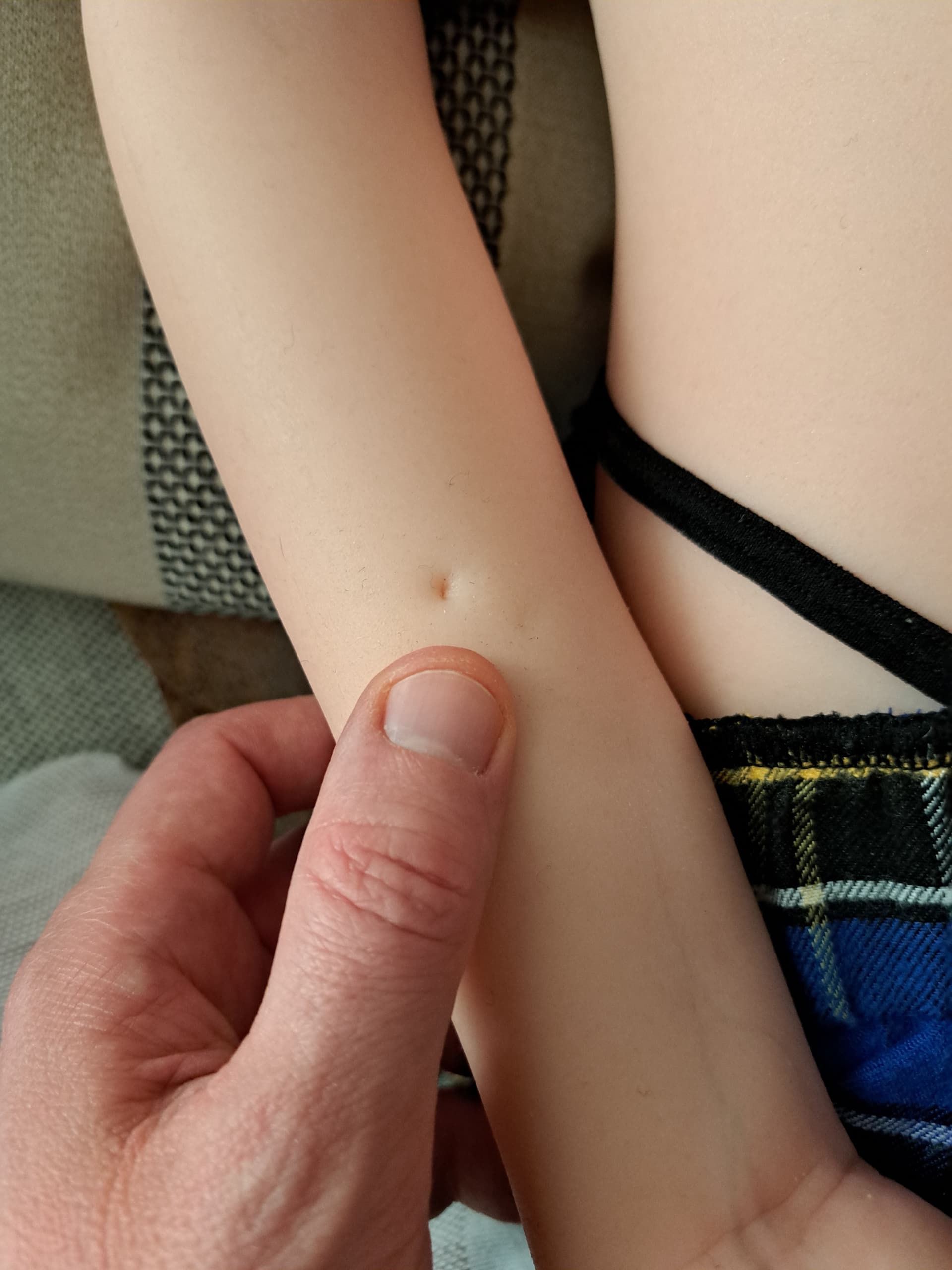 This morning as I was uncovering my precious new doll to see an indent had appeared on her left calf.