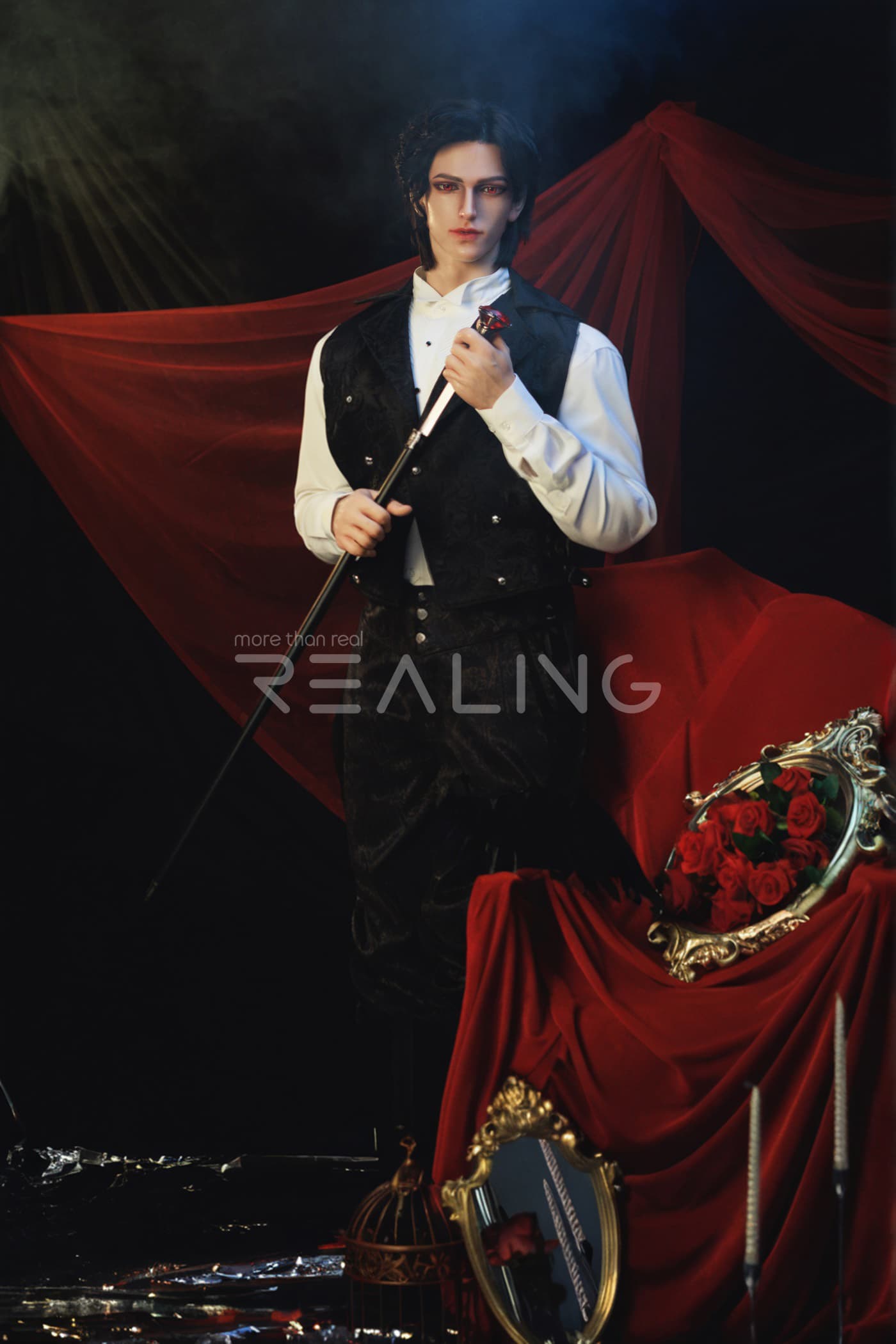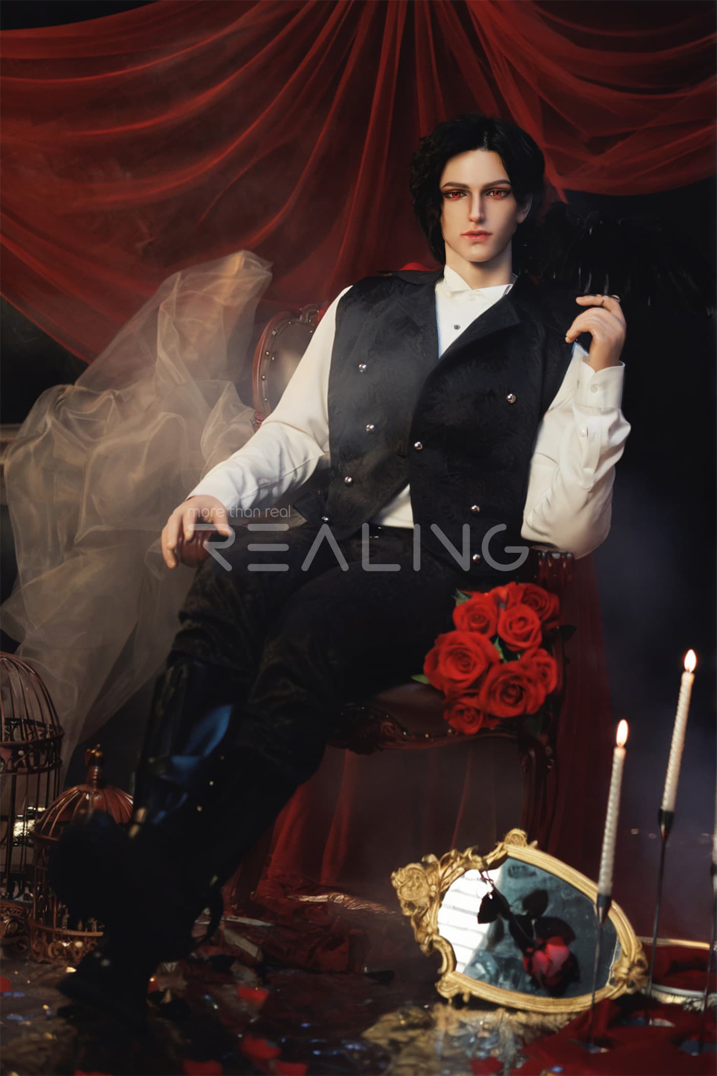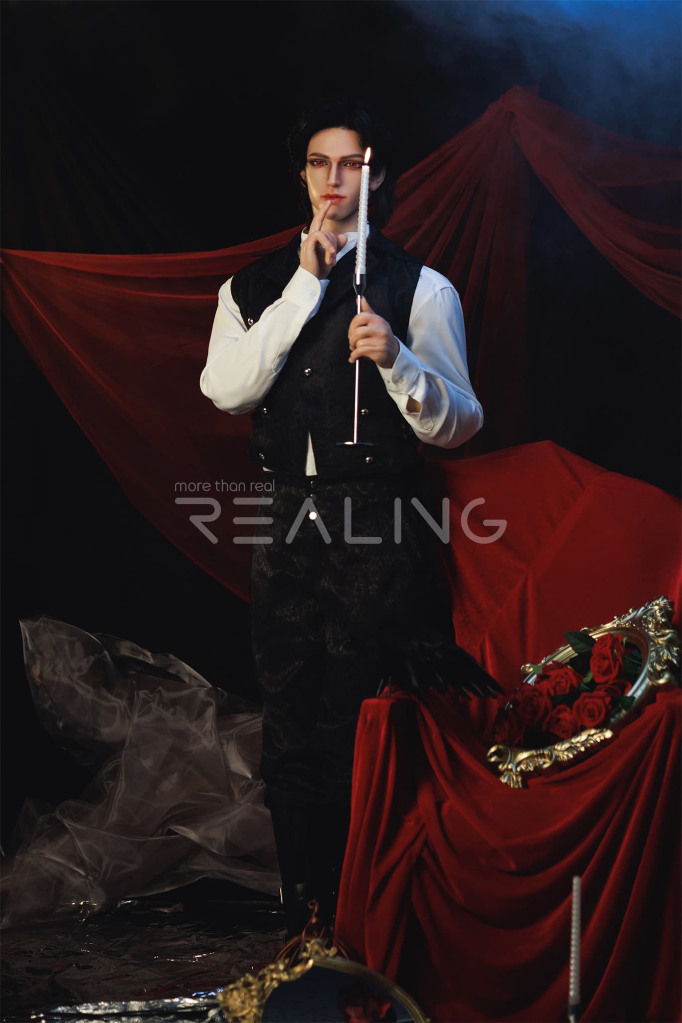 In a room filled with flowers and roses, a few candles, combined with the red curtains, gives off a cold and elegant vibe reminiscent of a vampire count, and exudes a unique and handsome style. Unlike the previous model of Hilary which had an oriental flavor, this doll has a very distinct European style. I wonder if all of you friends would like the style of this Micah?
