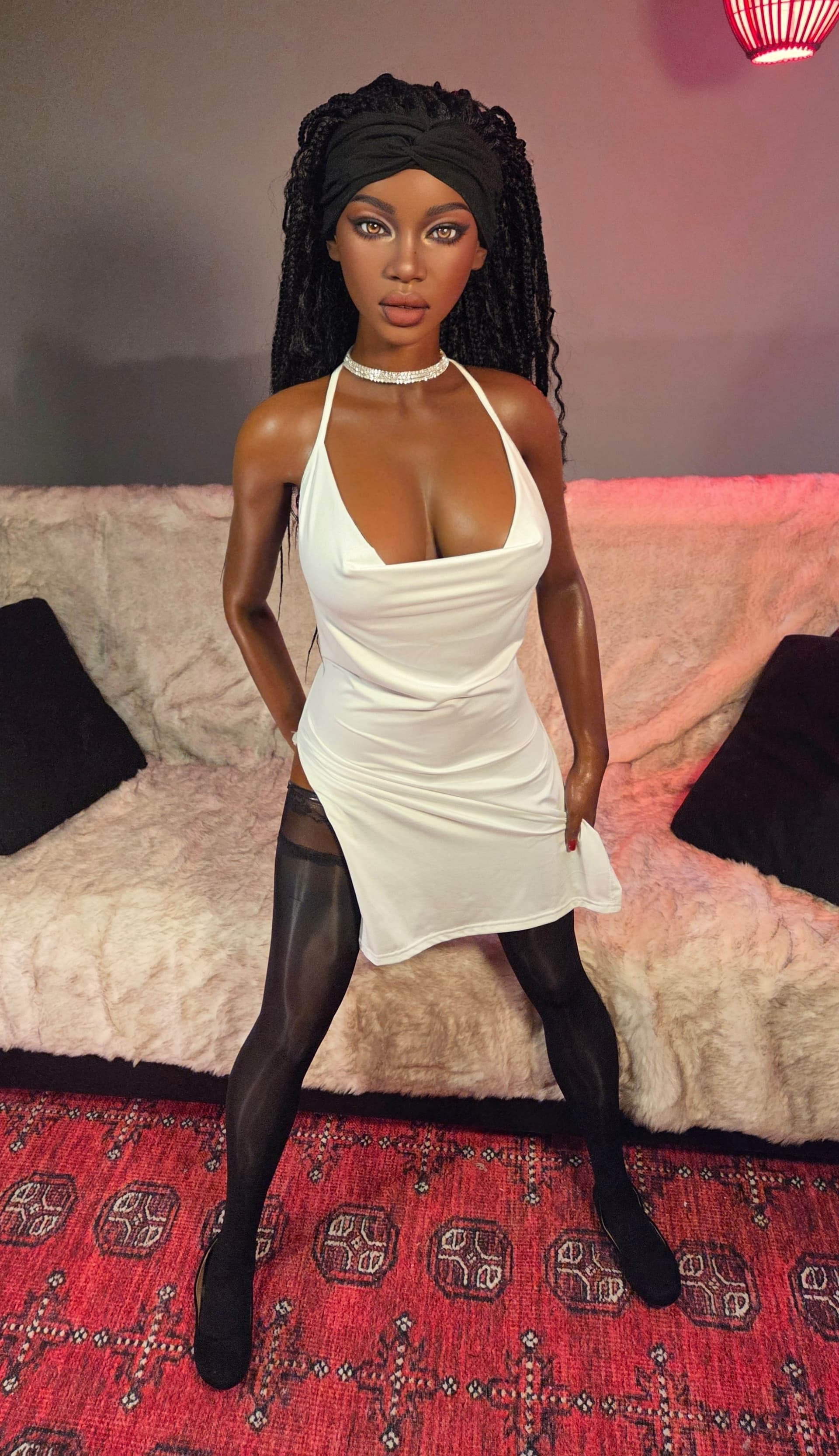 Amazing look for her. White dress, black hosiery. Ya that’s HOT!