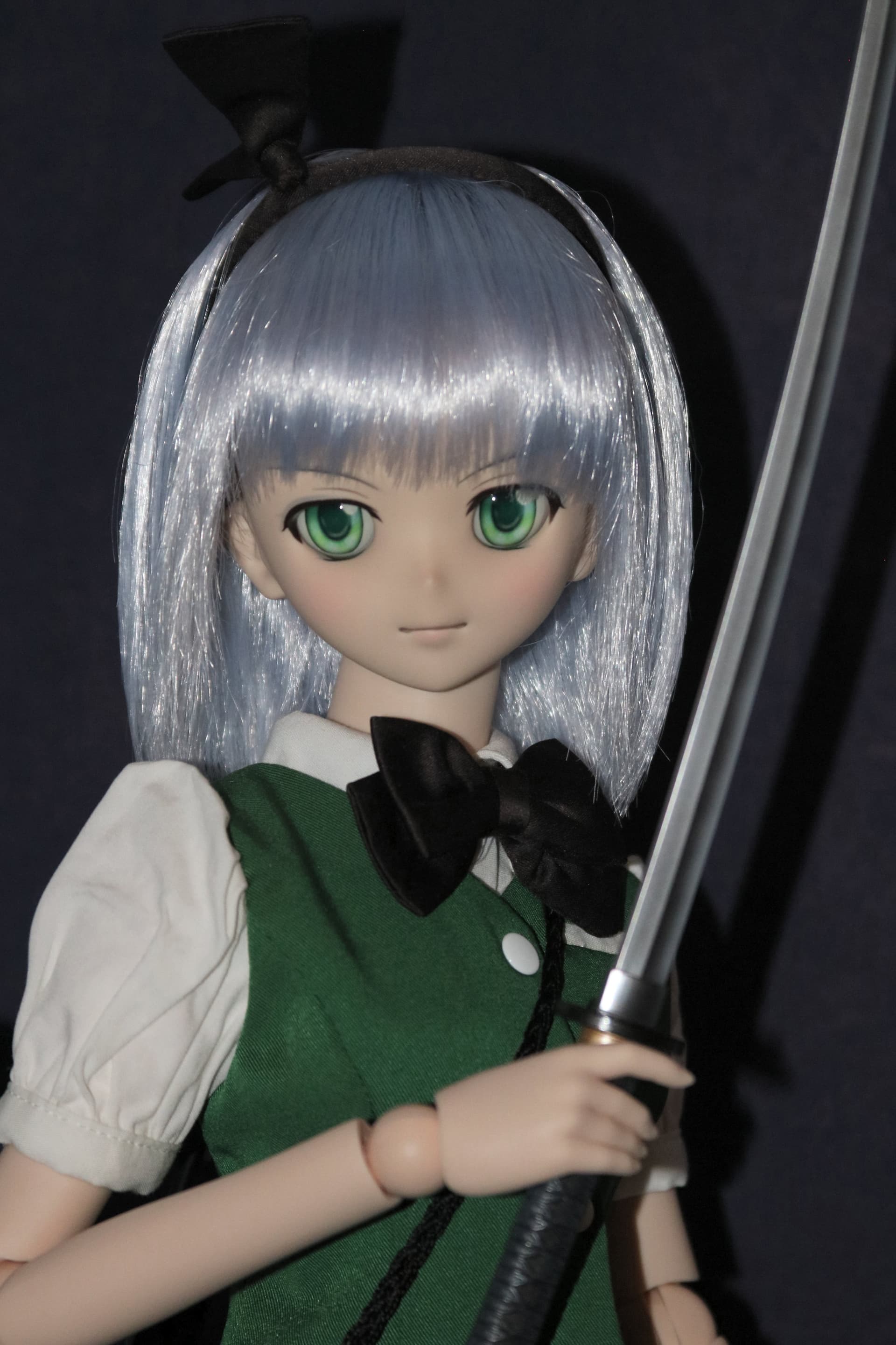 Youmu is a Dollfie I got back in February, Today I decided to fit her weapons which involves tying knots in small things which Iโm not very good at. I had to tie the flower to the scabbard with a ribbon, I was wishing I had 3 hands. So far none of it has fallen off.